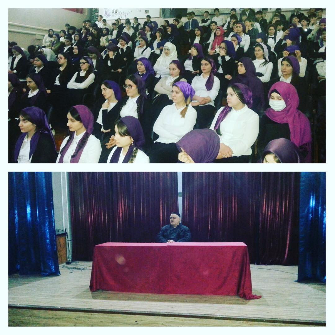 В рамках Единой концепции духовно-нравственного воспитания и развития подрастающего поколения, реализуемой в регионе по поручению Главы Чеченской Республики, Героя России РАМЗАНА АХМАТОВИЧА КАДЫРОВА, сегодня педагог по духовно-нравственному воспитанию Азимов С-А.Х. встретился учащимися 9-11 классов, где были затронуты множество тем:Соблюдение канон Ислама, традиции наших предков,послушание родителям, остерегаться и не поддаваться провокациям лжеидиологии ваххабизма, а также не поддаваться пагубному употреблению и распространению алкогольных и наркотических веществ.