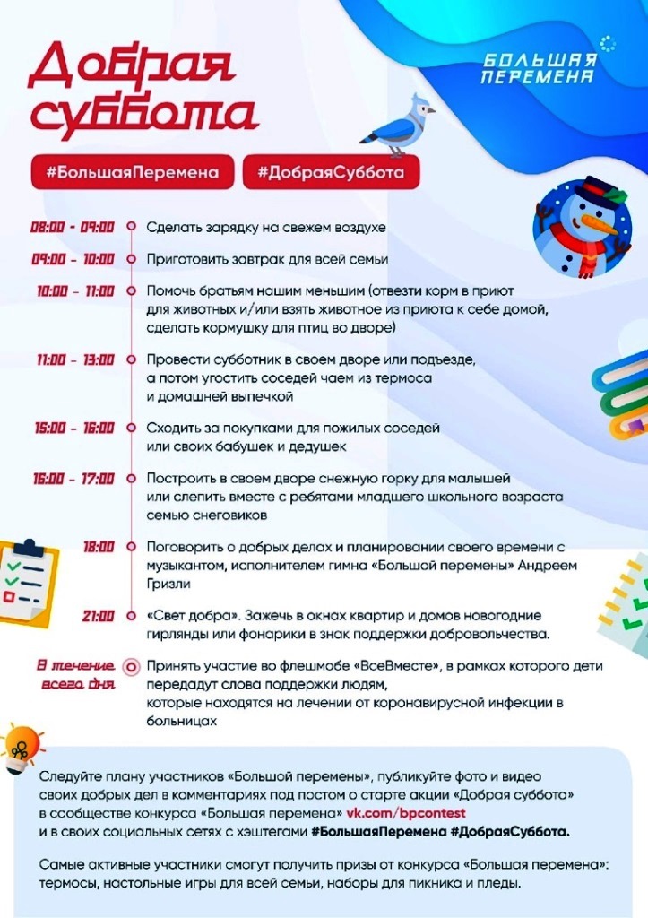 25.01.2021Друзья, приглашаем всех присоединиться к акции «Добрая суббота»!Её придумали участники Всероссийского конкурса для школьников «Большая перемена» – проекта президентской платформы «Россия – страна возможностей».⠀Идея акции – в том, чтобы посвятить субботу добрым делам.Помочь по дому родителям. Сделать уборку в подъезде и во дворе.Отвести лакомства в приют для животных и так далее. Есть даже расписание и список добрых дел на ближайшую субботу, 23 января!⠀А ещё можно публиковать фото и видео своих добрых дел в соцсетях с хэштегами #БольшаяПеремена и #ДобраяСуббота.Самых активных участников наградят классными подарками.
