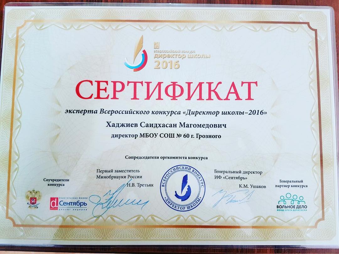 Сертификат эксперта Всероссийского конкурса "Директор школы - 2016"