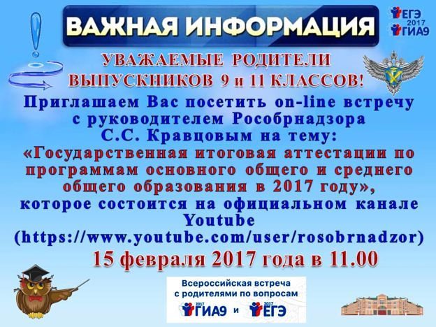 13.02.2017Информация для родителей!15 февраля 2017 года в 11:00 по московскому времени руководитель Федеральной службы по надзору в сфере образования и науки проводит Всероссийскую встречу с родителями по вопросам проведения государственной итоговой аттестации по программам основного общего и среднего общего образования в 2017 году.