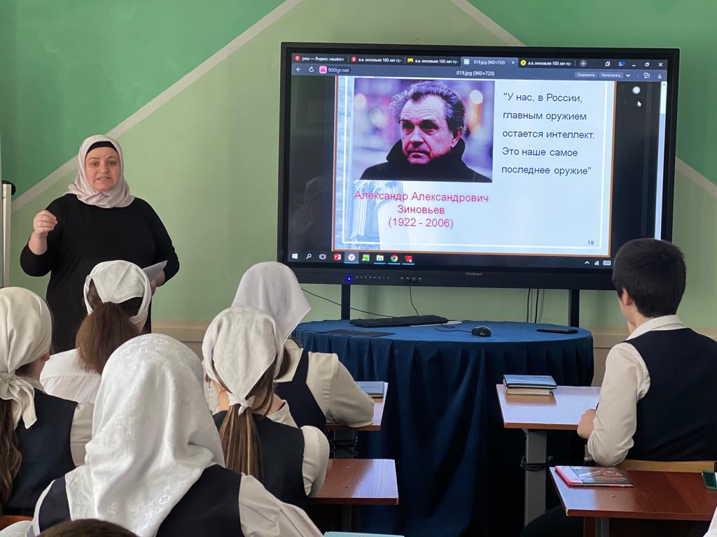 21.04.2022Сегодня в МБОУ "СОШ№60" г. Грозного прошел открытый урок литературы на тему "Александр Зиновьев и наше время" в рамках празднования 100-летия со дня рождения всемирно известного писателя, первого философа России XX века А.Х. Зиновьева