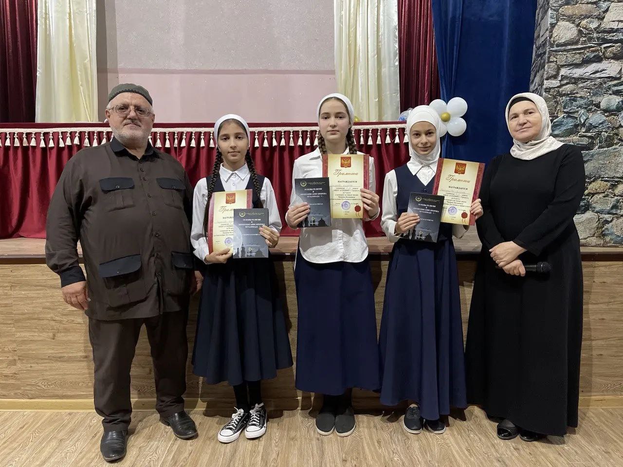 Участие в конкурсе приняли учащиеся 6-8-х классов. Их знания жизненного пути лучшего из людей - Пророка Мухаммада (да благословит Его Аллах и приветствует) и основ Ислама оценивало жюри, в состав которого вошли педагог по духовно-нравственному воспитанию Азимов С-А.С., социальный педагог Арсамыкова Х.В.Конкурс проводился с целью организации изучения учащимися жизни и деятельности Пророка Мухаммада (да благословит Его Аллах и приветствует), а также пропаганды высоких духовных и нравственных идеалов, стремление следовать которым является обязанностью каждого мусульманина.По итогам конкурса первое место заняла ученица 7 "Б" класса Ахиядова Ясмина, призерами стали ученица 7"Б" класса Гайсумова Селима и ученица 6 "Е" класса Садаева Ясмина. Победитель и призеры были награждены грамотами и книгами о жизнеописании и деятельности Пророка Мухаммада ( да благословит Его Аллах и приветствует).