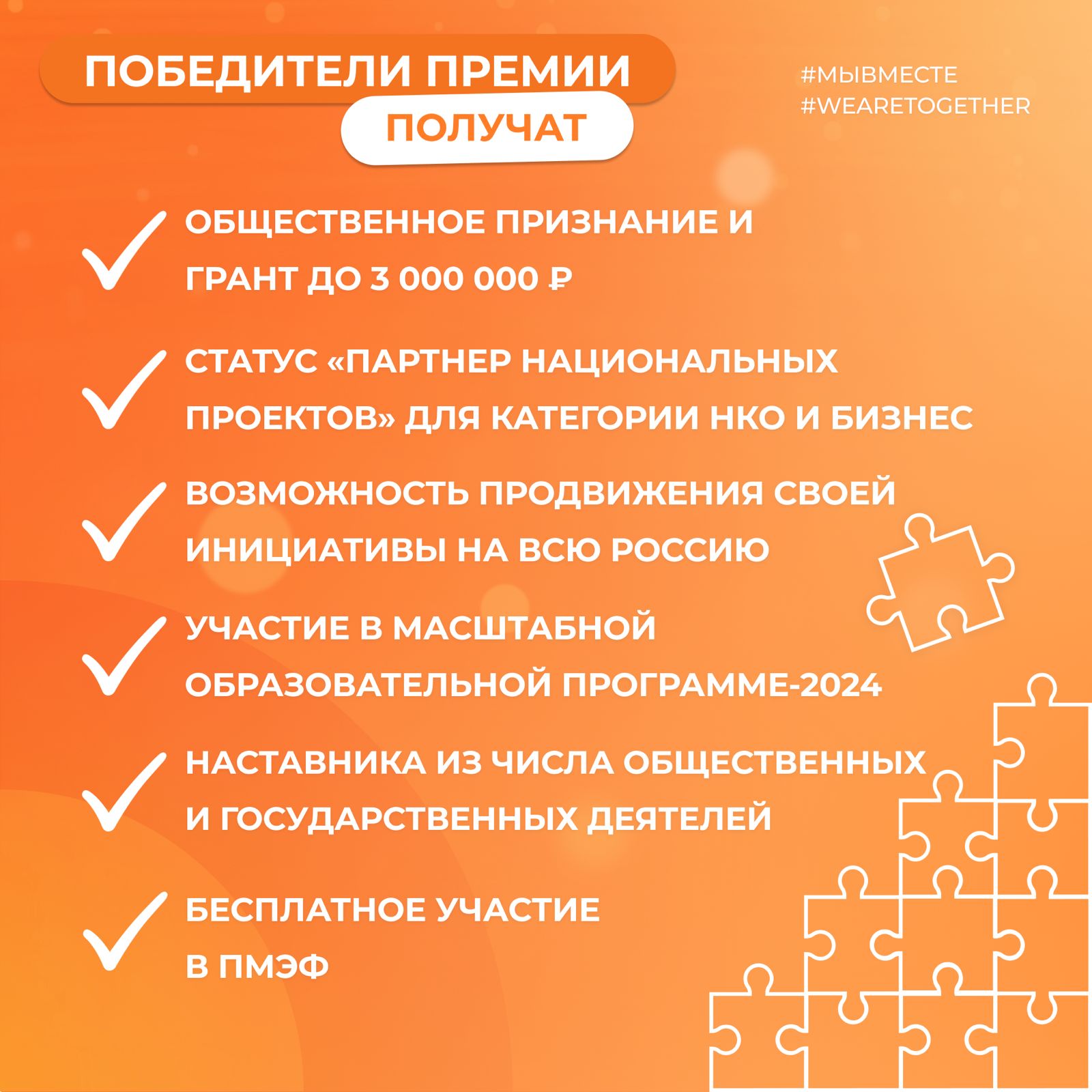 Свое согласие быть наставниками Премии #МЫВМЕСТЕ подтвердили Галина Карелова, заместитель Председателя Совета Федерации Федерального Собрания Российской Федерации, Мария Львова-Белова, уполномоченная при Президенте Российской Федерации по правам ребёнка, Антон Котяков, министр труда и социальной защиты Российской Федерации, Елена Ульянова, президент благотворительного фонда «Равенство возможностей», Рашид Исмаилов, председатель Общероссийской общественной организации по охране и защите природных ресурсов «Российское экологическое общество». Всего в этом списке будет 30 руководителей государственных, некоммерческих и бизнес-структур федерального уровня, заинтересованных в системных изменениях социальной сферы.Финалистов также ждут дополнительные возможности от партнеров Премии по каждой из номинаций: стажировки, вебинары и менторские встречи с топ-менеджментом, приглашение финалистов в качестве спикеров и экспертов, информационная поддержка.Среди партнеров номинаций - Министерство здравоохранения России, Министерство культуры России, Министерство науки и высшего образования России, Министерство просвещения России, Общественная палата России, Агентство стратегических инициатив, Президентский фонд культурных инициатив, АНО Центр развития культурных инициатив, Российский экологический оператор, Российское экологическое общество, Всероссийская общественная организация волонтеров-экологов «Делай!», Российское движение детей и молодежи «Движение первых», Российский Красный Крест, Лига здоровья нации, Благотворительный фонд «Система», ОАО «РЖД», телеканал Russia Today, Союз журналистов России, АНО «Институт развития интернета», Уполномоченный по правам ребенка при Президенте РФ, АНО «Россия – страна возможностей», Торгово-промышленная палата Российской Федерации, Опора России, Деловая Россия, Фонд по поддержке социальных проектов, Фонд «Наше будущее», АНО «Союз волонтерских организаций и движений», Волонтеры-медики.ЧТО ПОЛУЧАЮТ ПОБЕДИТЕЛИ