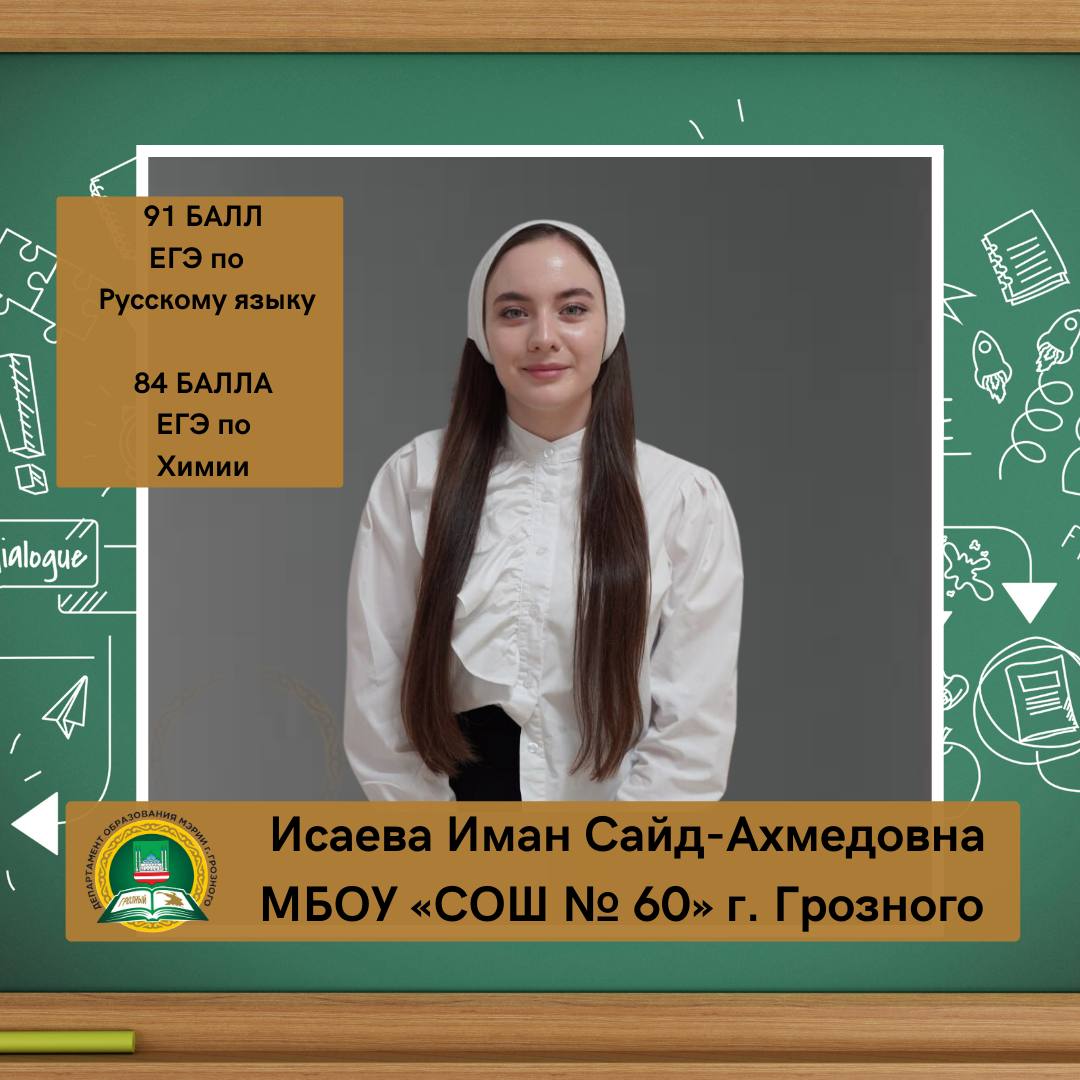 Иман Сайд-Ахмедовна Исаева, ученица МБОУ «СОШ № 60» г. Грозного, набрала на ЕГЭ 91 балл по русскому языку и 84 балла по химии.