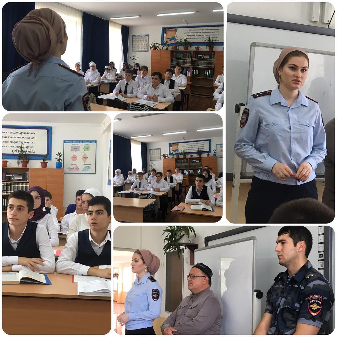 12.09.2017Инспектор по делам несовершеннолетних Мотузова Мадина и участковый 6-го микрорайона Ибрагимов Ислам встретились с учениками 9-х классов.