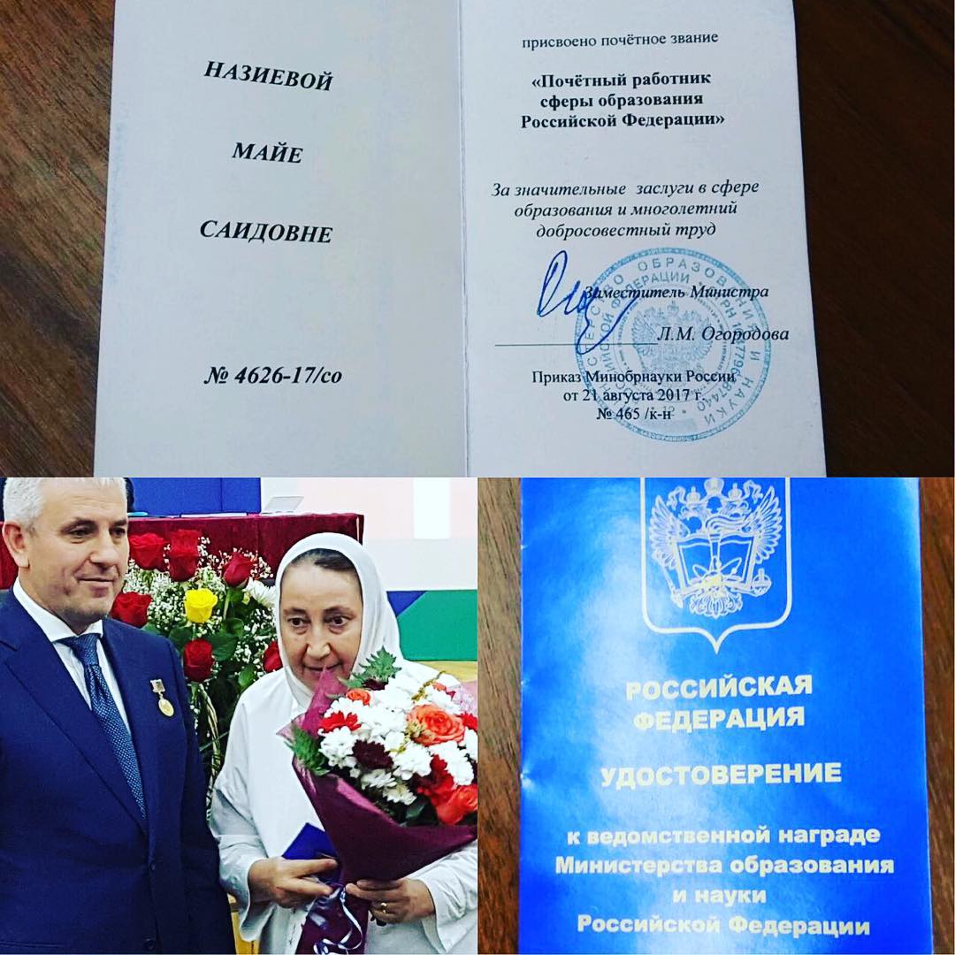 Сегодня нашему коллеге, Назиевой М. С., учителю русского языка и литературы, присвоено звание Почетный работник сферы образования РФ. Малика Саидовна отличается высоким профессионализмом и мастерством. В своей работе она применяет не только общеизвестные методы и приемы, но и нестандартные подходы, способствующие гармоническому развитию личности детей. Многолетний добросовестный труд нашего соратника способствовал воспитанию не одного успешного ученика и доброго человека. Как пример: ученик Малики Саидовны, выпускник Ясулов Эмин, поступил в один из ведущих вузов страны. Искренне поздравляем нашего коллегу! Малика Саидовна, Дала т1аьхье беркате йойла!