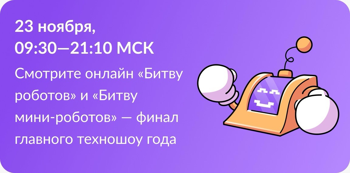 19.11.202423 ноября с 09:30 до 21:10 состоится полуфинал и финал Международного чемпионата по битве роботов, который способствует продвижению инженерной мысли как драйвера развития и поддержки современных цифровых технологий.