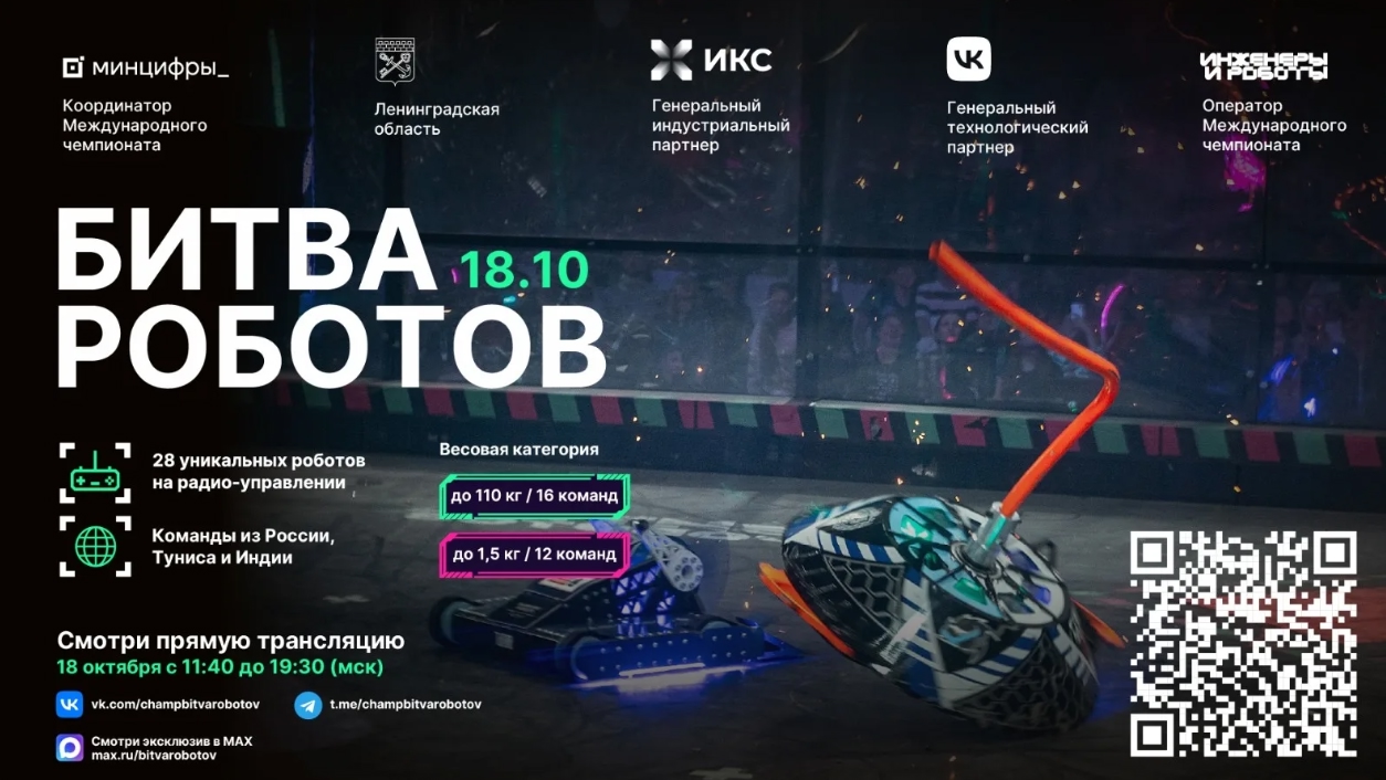 14.10.2025Уважаемые друзья, 18 октября 2025 года с 11:40 до 19:30 состоится третий отборочный этап Международного чемпионата по битве роботов сезона 2025 года. В нем сразятся 28 команд из России, Туниса и Индии: 16 команд в рамках дисциплины «Битва роботов» в весовой категории до 110 килограмм и 12 команд в рамках дисциплины «Битва мини-роботов» в весовой категории до 1,5 килограмм. Среди участников – команды Московского государственного технического университета им. Н. Э. Баумана, Университета науки и технологии «МИСиС», Национального исследовательского ядерного университета «МИФИ», Российского государственного социального университета, Белгородского государственного технического университета им. В. Г. Шухова и других ведущих университетов. Мероприятие пройдет 18 октября с 11:30 до 19:30 на территории Всесезонного курорта «Игора» при поддержке Правительства Ленинградской области. Программой мероприятия предусмотрено два шоу: дневное (с 13:00 до 14:30) и вечернее (с 18:00 до 19:30).